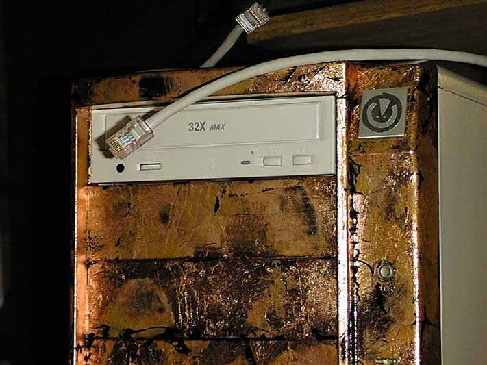 This hapless PC has been copper-leafed and chemically distressed. The badge is etched aluminium. I used sticky tape as etch-resist and potassium hydroxide for the etchant.