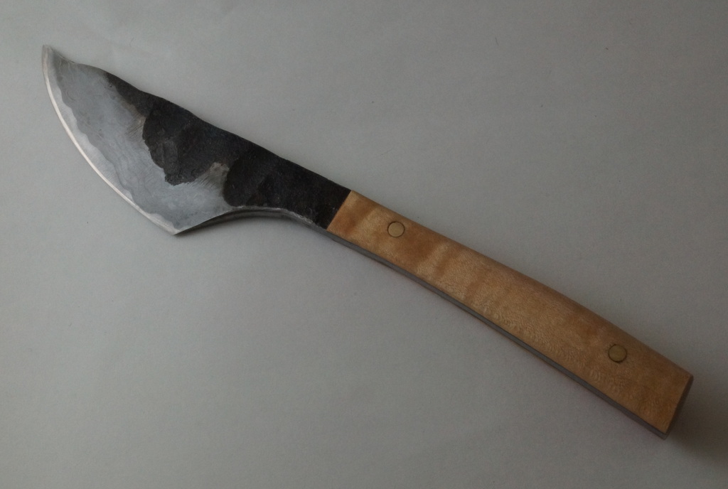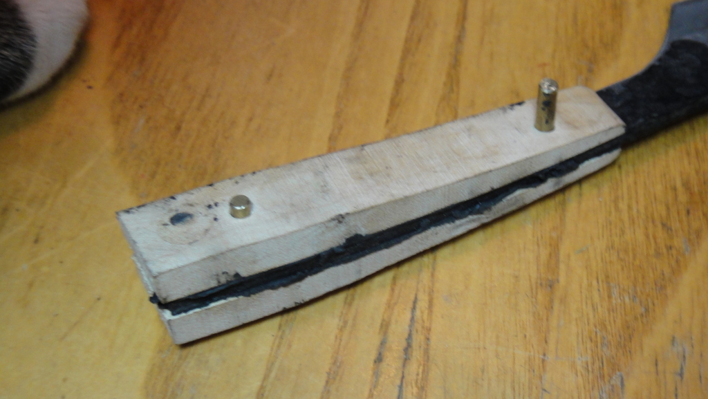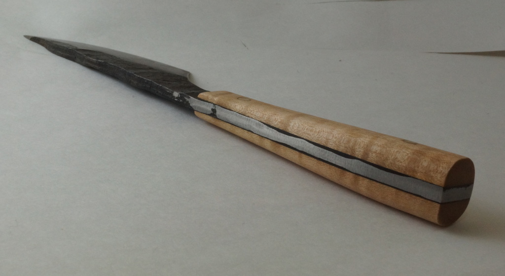 Curly maple scales, brass pins, black Milliput expoxy putty between wood and steel: