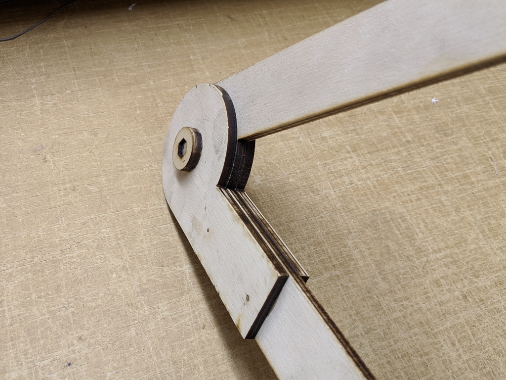 Lasercut 6mm ply, hair ties, center punch, cocktail stick for alignment, wood glue, M6 bolt & wingnut.