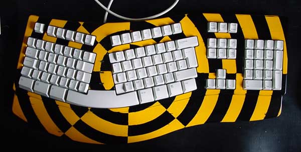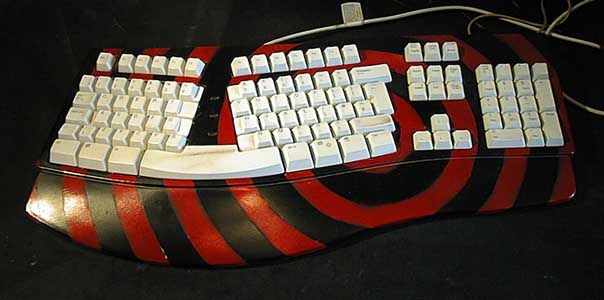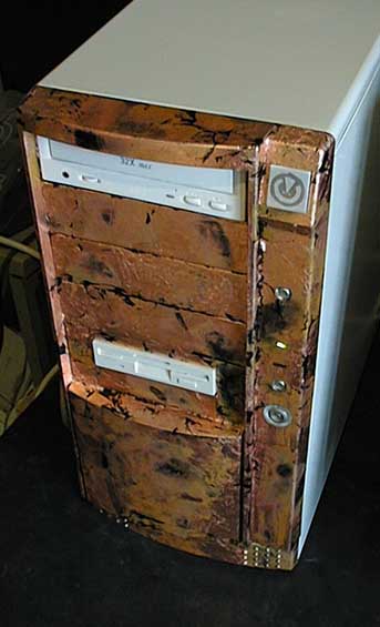 This hapless PC has been copper-leafed and chemically distressed. The badge is etched aluminium. I used sticky tape as etch-resist and potassium hydroxide for the etchant.