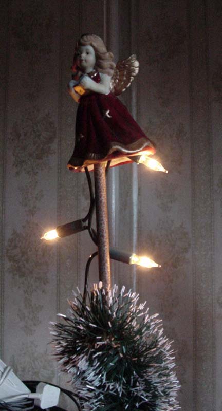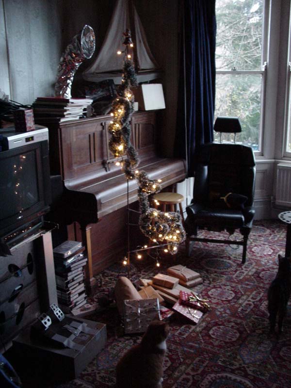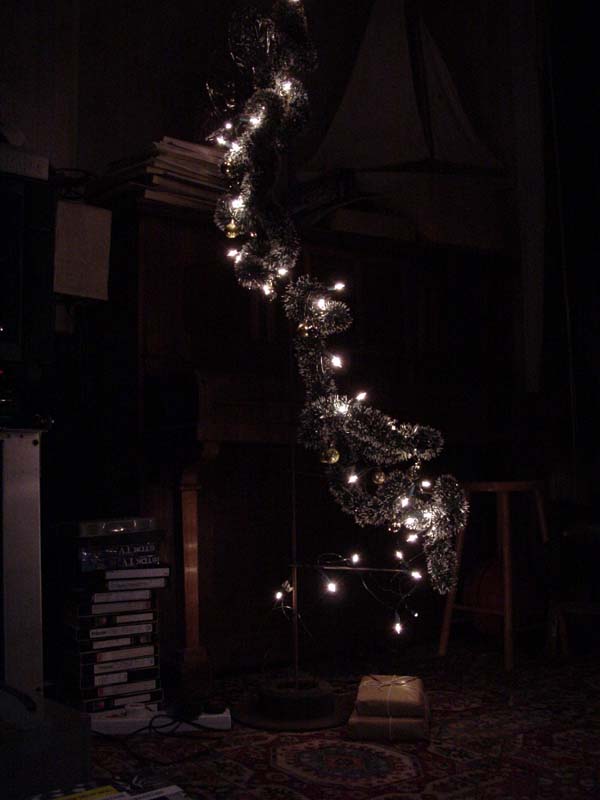 A minimal steel christmas tree, with decoration by Donna.
