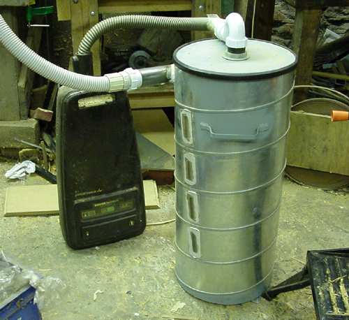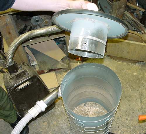 And all this hardwood dust would need some collection, so I made a little cyclone. The suck comes from an old dometic Hoover, whose bag catches the finest dust. Remarkably little gets past the cyclone, though. It's made of a chunk of ventilation ducting, with a welded-on base and a loose lid (suction holds it on very well). The lid seal is from an old DEC disc pack. I'm proud to say that the only non-scrap components in this are the plumbing fittings.