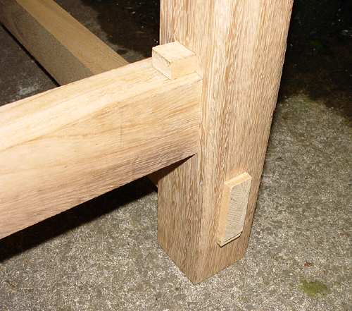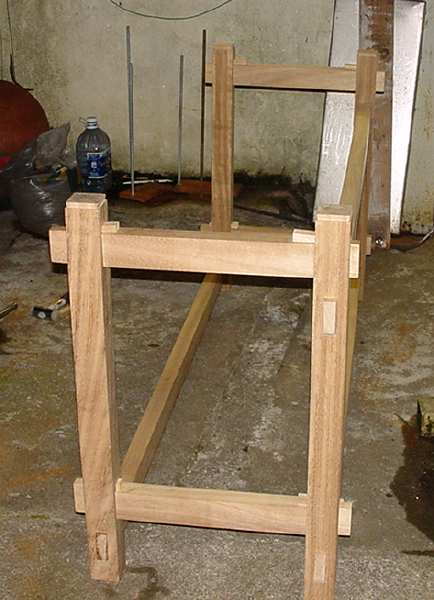 The completed frame, on first test-fit. It's made of Iroco, and held together with wedged dovetails (and nothing else - no glue or screws). These joints took ages - 4 or 5 days.