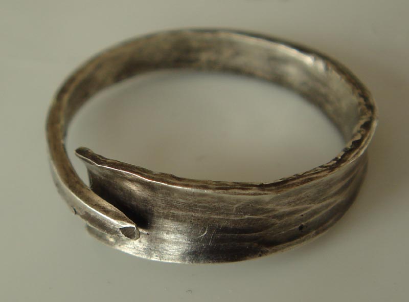 Forged from sterling silver, heat-patinated.