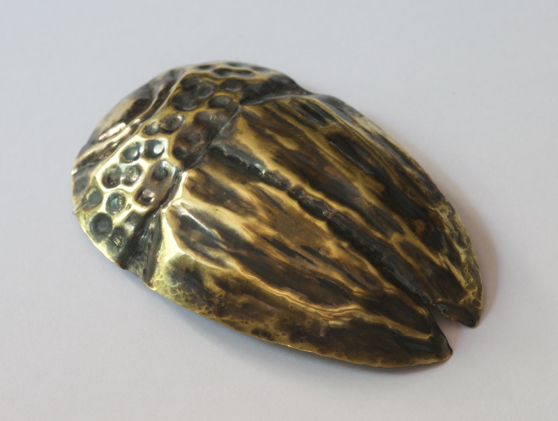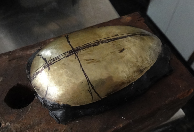 Thin brass (0.3mm), domed then hammered on a softish modelling wax. The wax was propbably a bit too soft to make this work properly. I'll try a harder one next time.