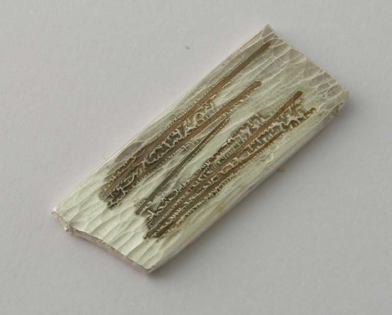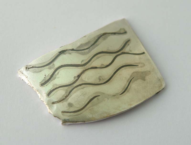 Brass wire, soldered to fine silver, forged & filed flat, then etched in ferric chloride. That leaves a pinkish silver chloride on the surface of the silver The chlorine is driven off by gentle heating, but the black survives.
