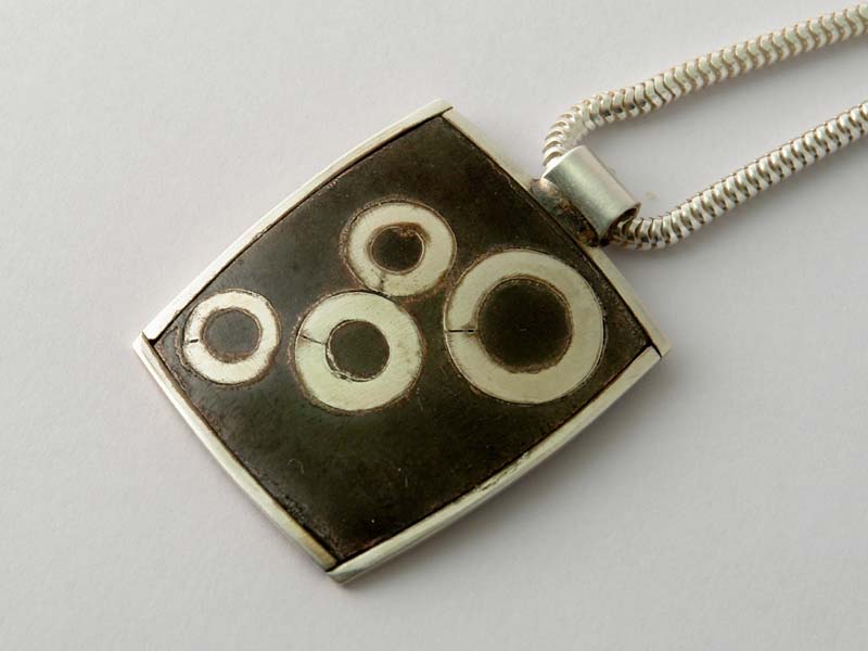Silver rings, soldered to a copper backing, forged and filed flat. The copper was etched in ferric chroride then heat-blackened.
