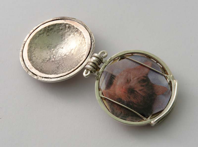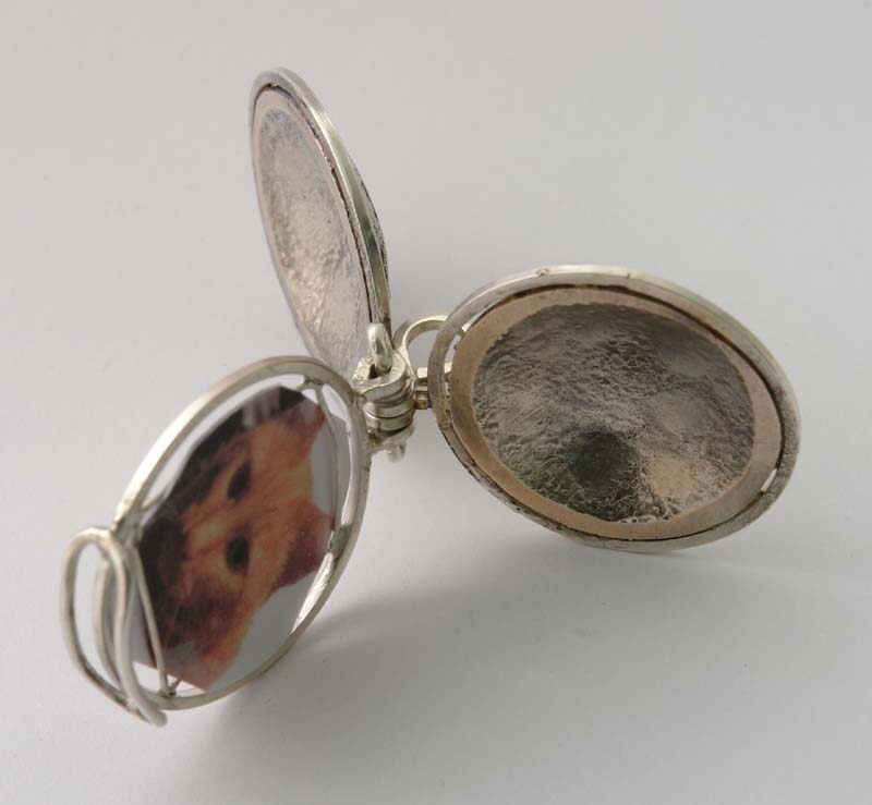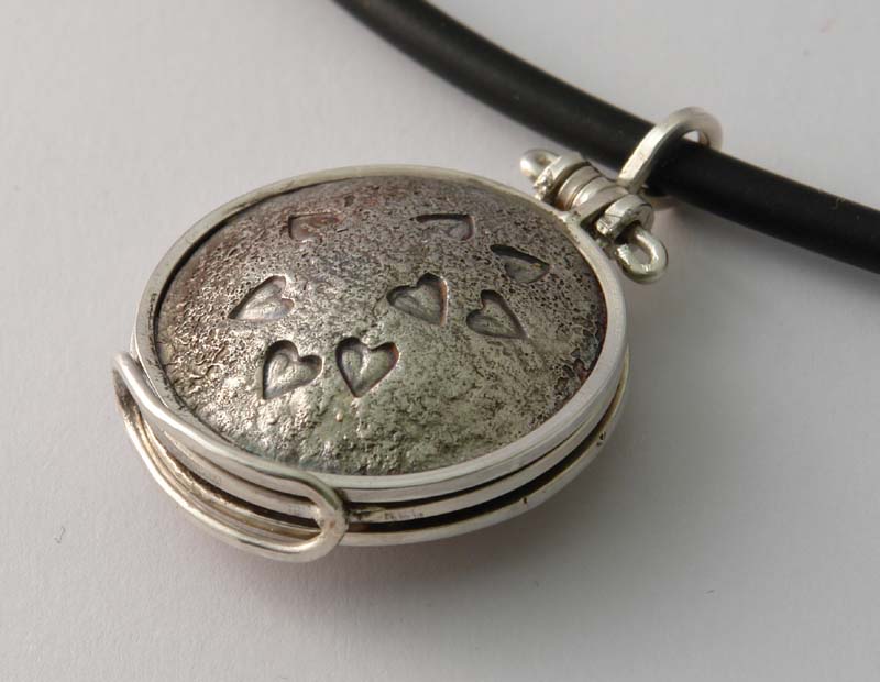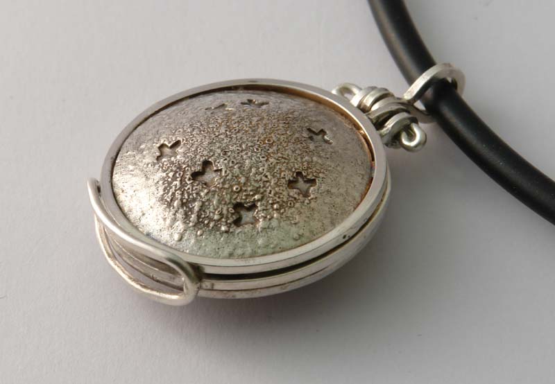 Shibuichi (copper with 25% silver), reticulated, punched and domed.