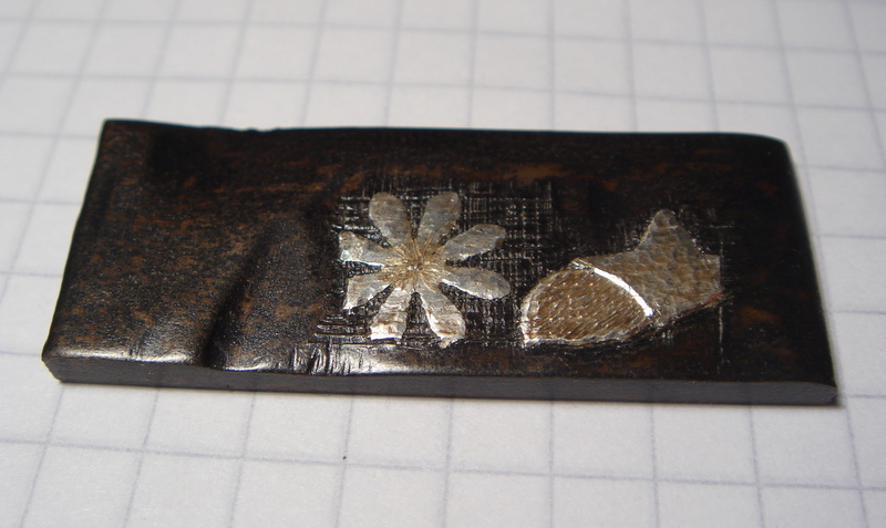 I stumbled across a description of 'nunome zogan', a Japanese inlay (or, I guess, on-lay) technique. A hard metal - iron or steel, usually - is given a file-like texture with a chisel, and a soft metal (silver or gold) is hammered into it. After burnishing and planishing, the soft metal is permanently attached. The iron is usually patinated to give a strong contrast.