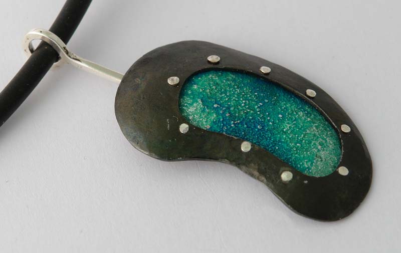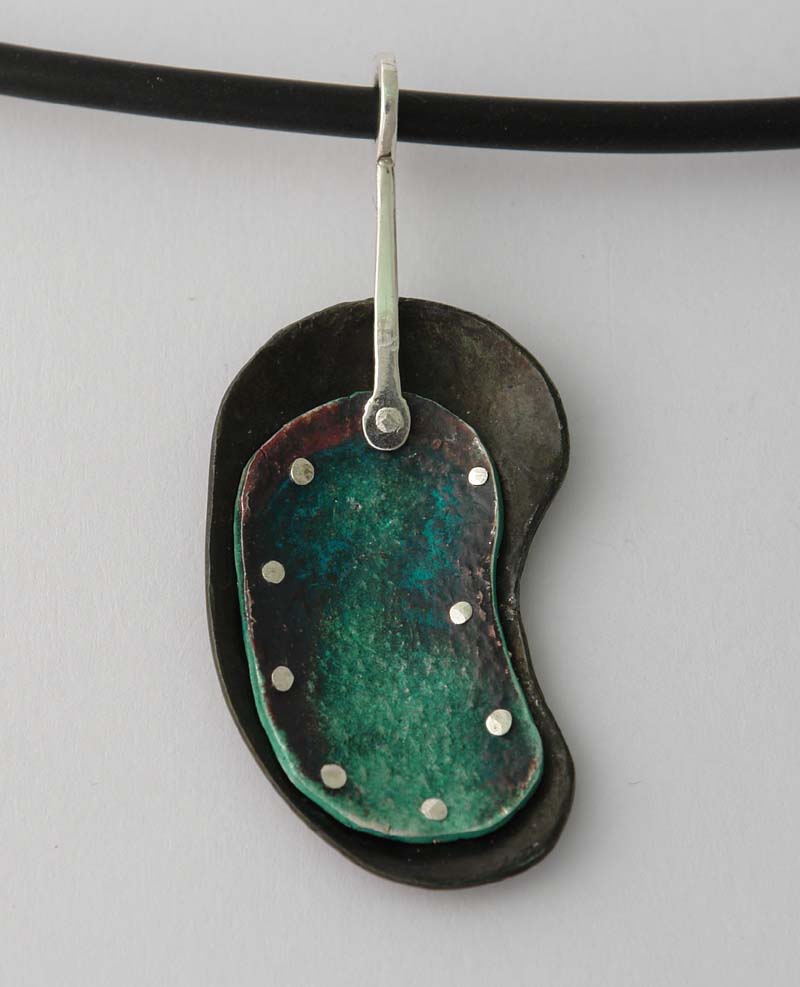 Reticulated shibuichi, ammonia/vinegar patina, oil-blackened steel, silver rivets