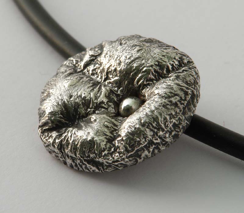 Silver with 18% copper, reticulated and inflated with dissolved oxygen. The grooves are made by binding with stainless wire during the inflation.