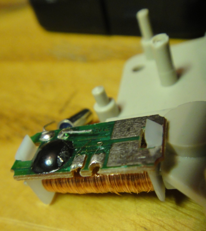 The rotor is a little toroidal magnet. The coil is driven with 25mS pulses, one per second, in alternate directions.