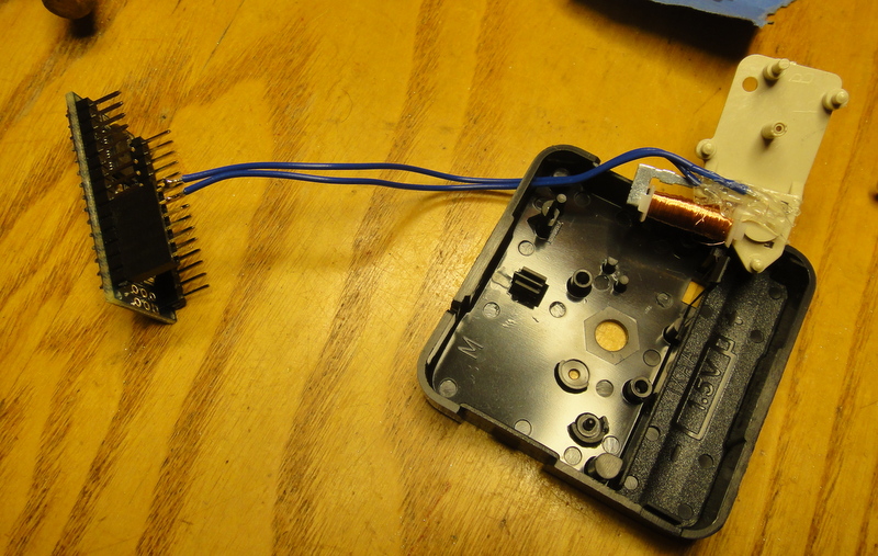 The only wiring required is to connect the clock coil to pins 2 and 3 of the Nano. I used a bit of header strip to make it unpluggable, but you could solder straight onto the Nano pins if you want.
