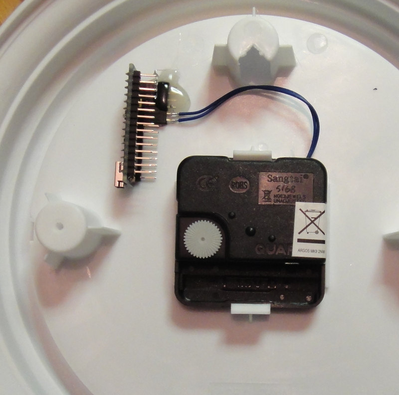 We start with a cheap quartz clock (£2.47 from Argos). A cheap clock has a loud and rattly tick, perfect for this application.