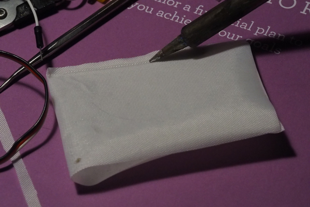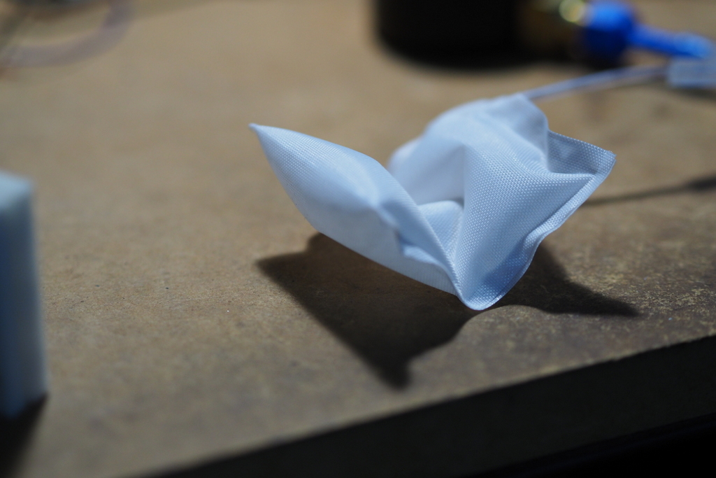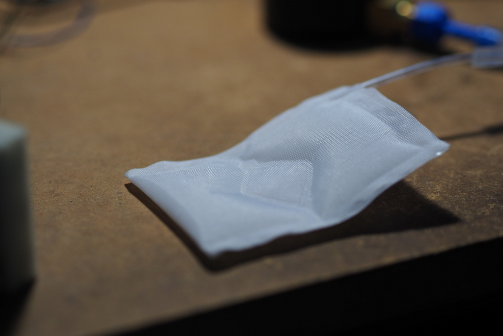I tried a couple of other fabrics in this session - a stretchy lycra knit and a very mobile woven nylon, used on the bias - but both of them came out so leaky that the little pump couldn't get them up to pressure. A water immersion test showed that they were pinholed all over. Which suggests (unsuprisingly) that this glue film isn't sturdy enough to make these assemblies airtight, they need an air-proof fabric backing up the film.
