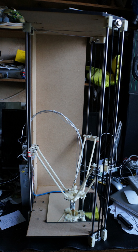 When that was done, I installed the Printrun / Pronterface Windows binaries (which also installed Slic3r). Pronterface connected easily to the printer (at 25000 baud) and let me jog it up & down.Note that the x/y/z axes in Printerface are the cartesian axes, not the three delta axes!. At this point, the 'home' button in Pronterface should actually send the three cariages to the top and home them with the microswitches.