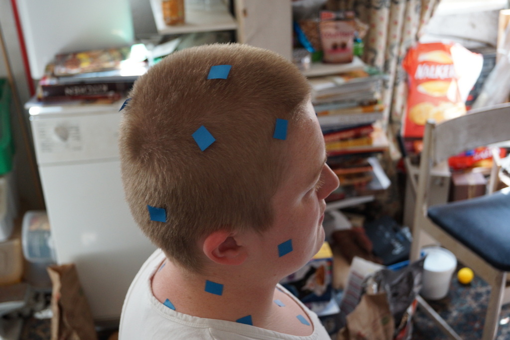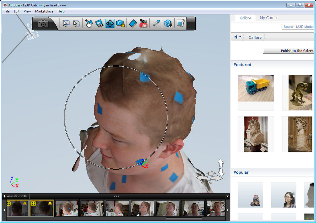 Our first couple of tries were abject failures, with terrible missing chunks and splits in the model that Catch produced. The winning recipe required a lot of photos, in three loops round his head. The loops were level, 45 degrees from above, and 45 degrees from below, and each loop was about 16 shots.